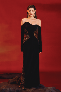 The design is a masterpiece of sophistication and allure. The off-shoulder neckline gracefully frames the collarbone, while the wavy embellishments add a touch of glamour. This straight dress is designed to enhance your silhouette, creating a flattering and elegant look. Whether you're attending a gala or a cocktail party, this dress is sure to make a statement. Step into the spotlight with confidence and style in this enchanting ensemble.