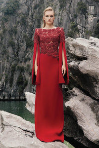 Boat Neck Floral Embellished Back Slit Dress - XS / Red