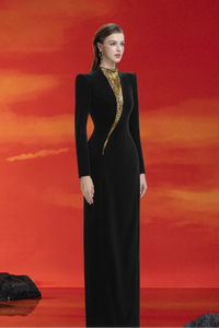Immerse yourself in luxury with this stylized flowing bead embellished dress, where luxurious golden beads delicately adorn the fabric, creating a luminous effect with every movement. The fluid, flowing silhouette adds an ethereal quality, while the long sleeves provide a sense of refined elegance. Ideal for making a grand entrance, this dress exudes timeless beauty, capturing the essence of sophisticated glamour.