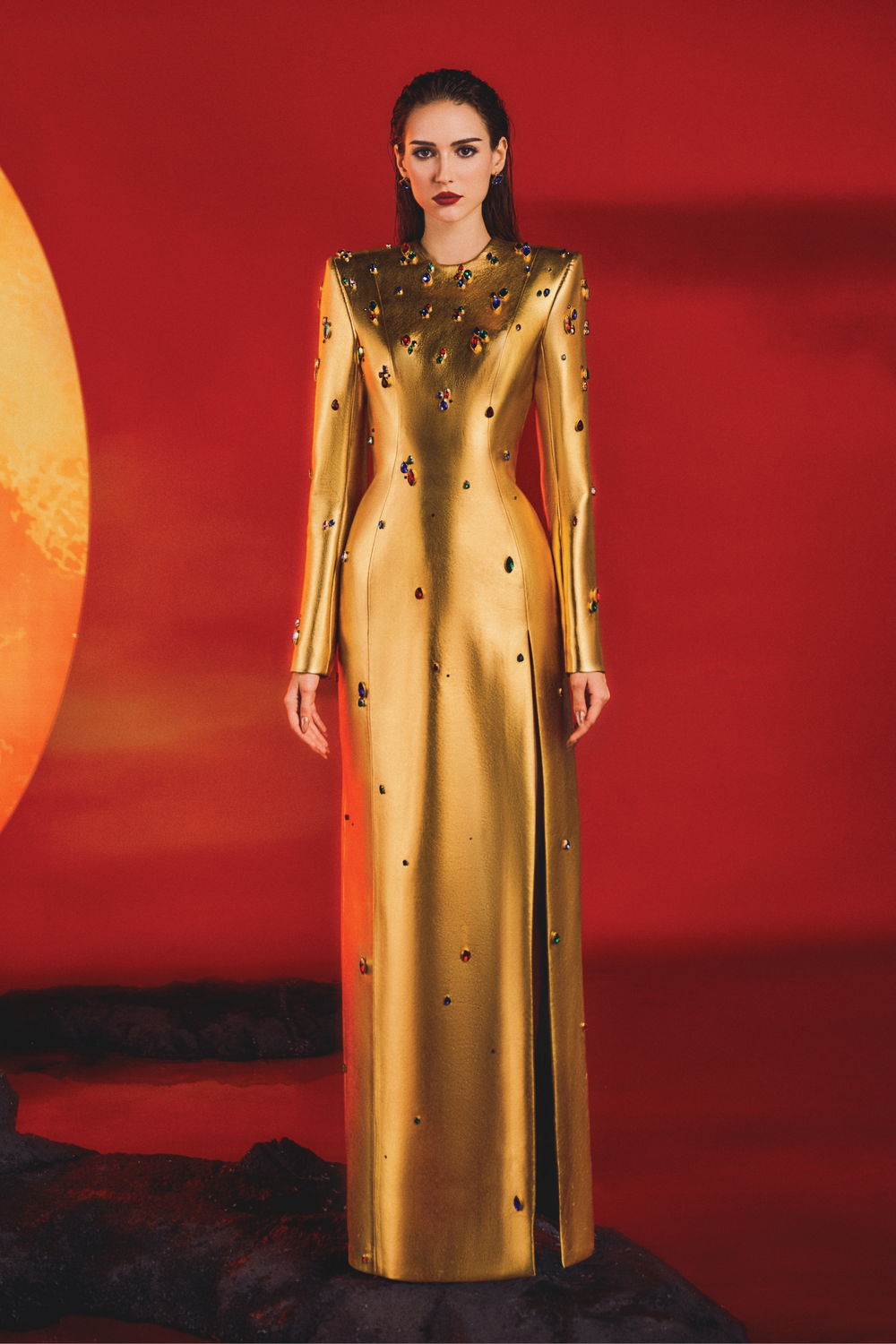 Drape yourself in elegance with our dress. This captivating ensemble exudes opulence and charm, featuring meticulously placed stone embellishments that sparkle with every movement. The long sleeves add a touch of grace, making it an ideal choice for upscale events and formal occasions. Make a statement and leave a lasting impression as you enchant the crowd in this radiant gown.