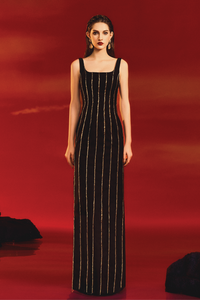 The unique design features a striking golden line that accentuates the asymmetrical shoulder, adding a touch of glamour and modernity. This dress is a perfect blend of sophistication and boldness, making it an ideal choice for those who want to make a statement. Elevate your style with this distinctive and fashion-forward piece, perfect for any special event where you want to shine.